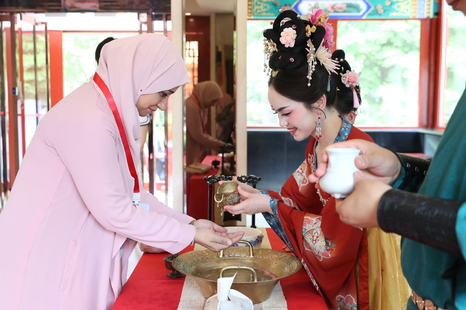 5月21日,中国国家创新与发展战略研究会与中国科学院大学国际学院在北京共同主办了521国际茶日主题活动。活动以“焕新·开放·共生”为主题,主要分为茶艺表演、中国传统文化展示、主题沙龙、圆桌对话等环节,让越来越多的外籍友人在茶文化中“读懂中国”。图为巴基斯坦驻中国大使夫人玛丽亚姆·马哈茂德在活动现场体验盥洗礼。(中新社)