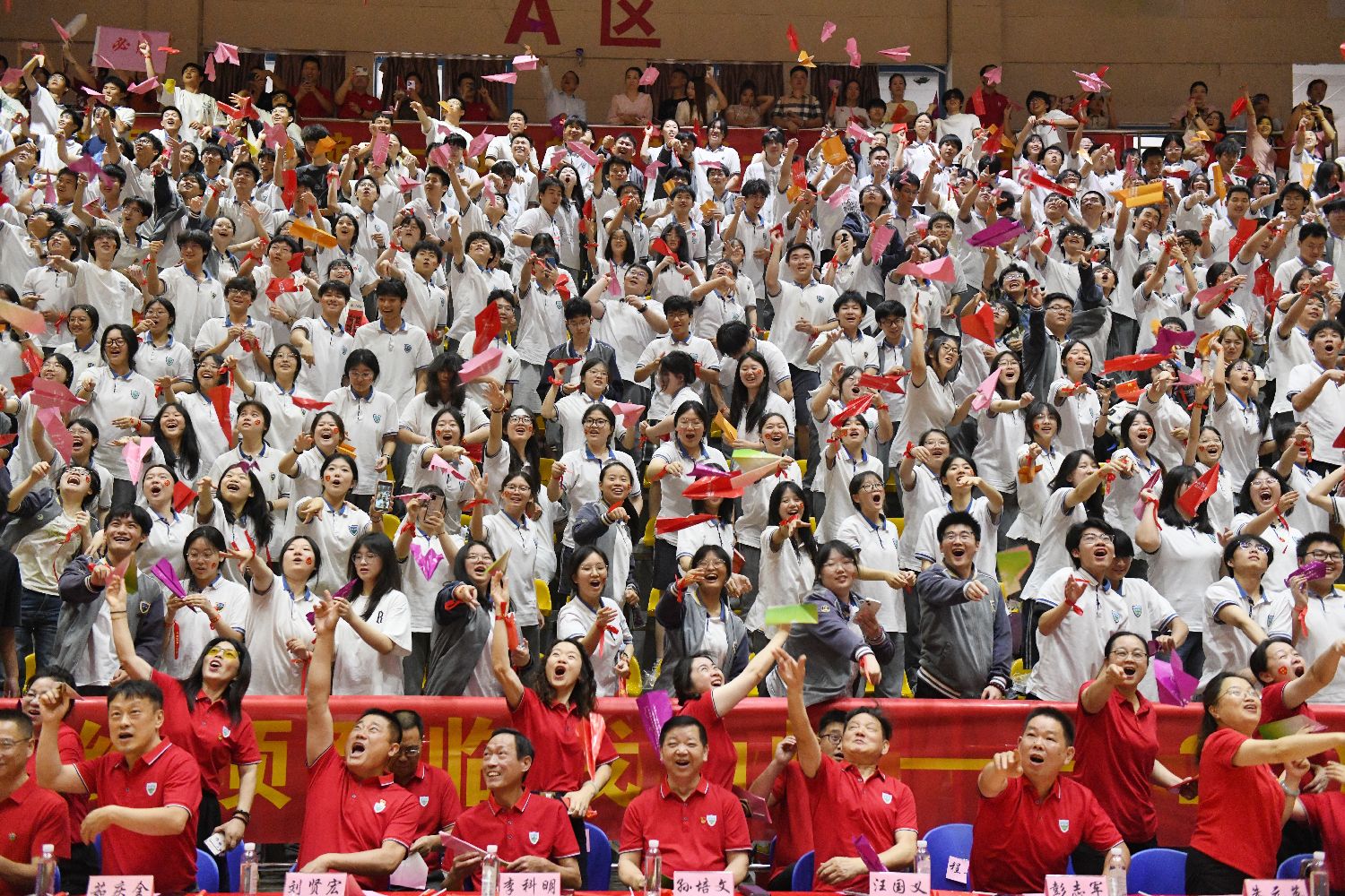 6月6日,2025年高考前夕,湖南省长沙市同升湖高级中学高三年级的老师与参加高考的考生们一同进行扔纸飞机、放礼花、顶粽子等活动,为同学们送上高考祝福,缓解考前压力。图为老师与考生一同放飞纸飞机。(中新社)