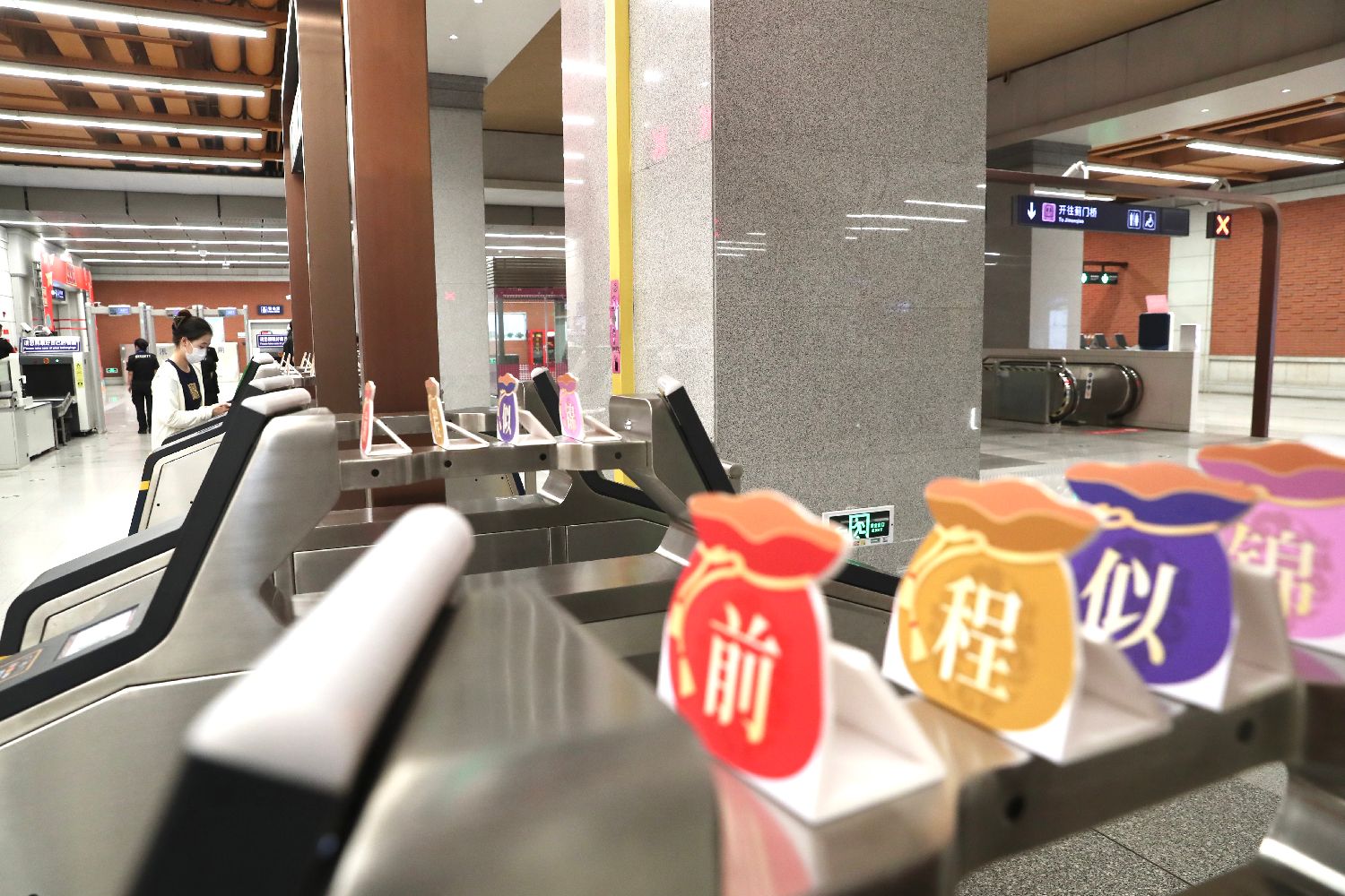 6月6日,北京地铁清河小营桥站,进站闸机处布置了前程似锦香囊装饰。2025年高考前夕,北京地铁对邻近考点的20座车站进行了装饰,为考生加油打气、爱心送考。(中新社)