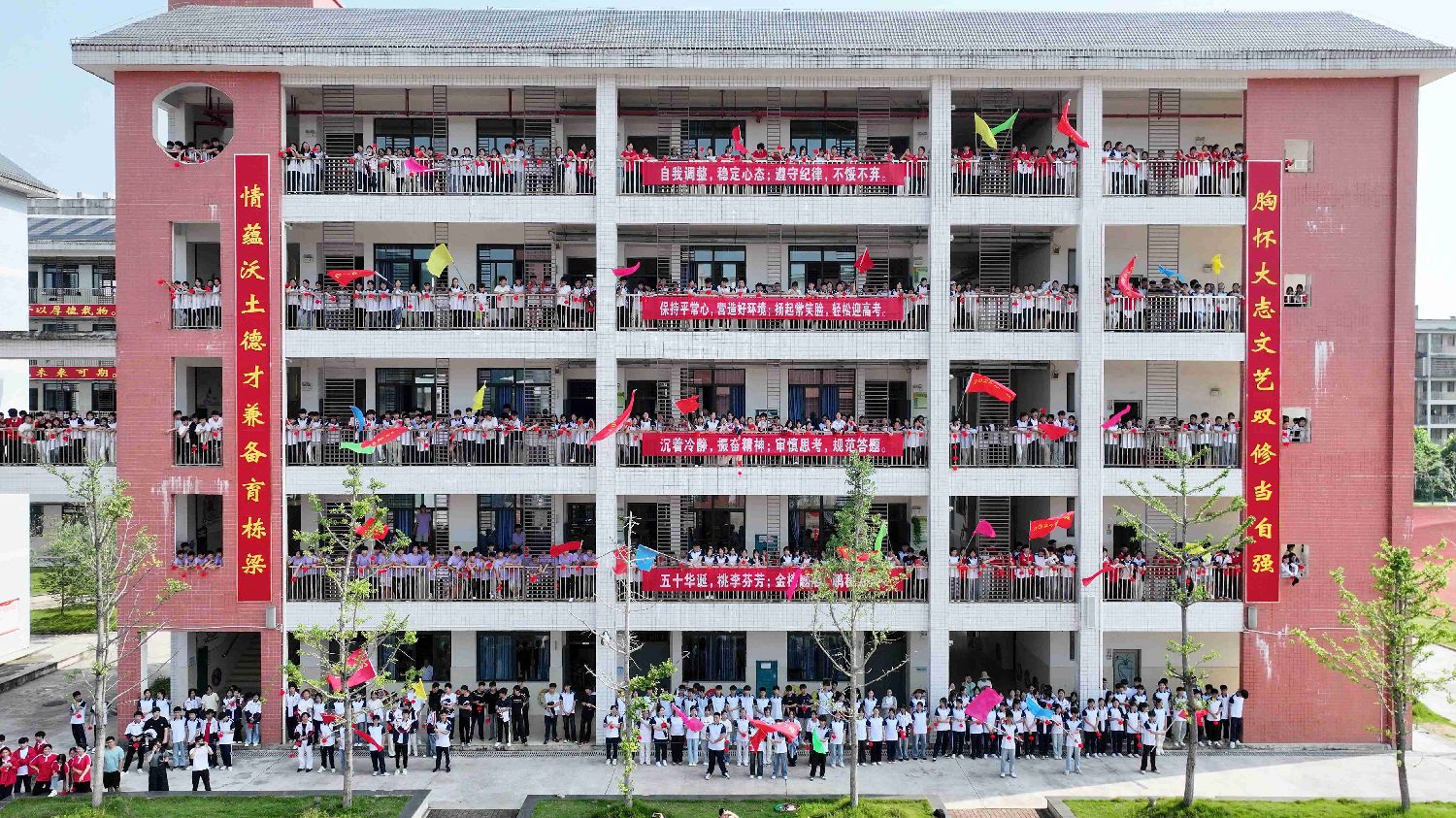 6月5日,广西融安县第二中学举行祝福高考“喊楼”活动,通过跃龙门、喊楼、挂灯笼等活动,为即将参加高考的学子助威呐喊。图为学生们在“喊楼”。(中新社)