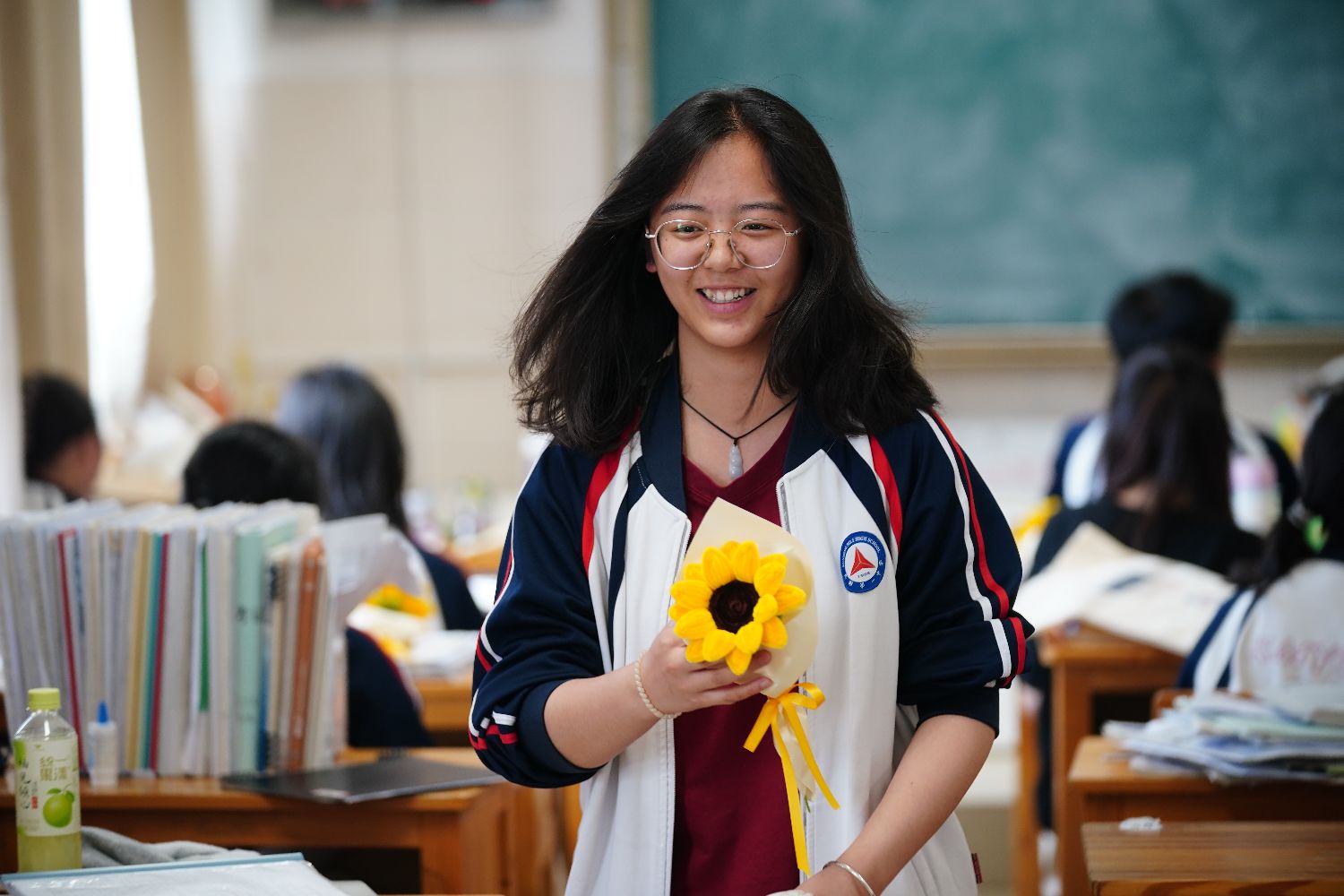 6月5日,高考即将来临,昆明市第一中学老师为高三考生精心准备了向日葵,祝福考生在高考一举夺魁。图为学生收到向日葵。(中新社)