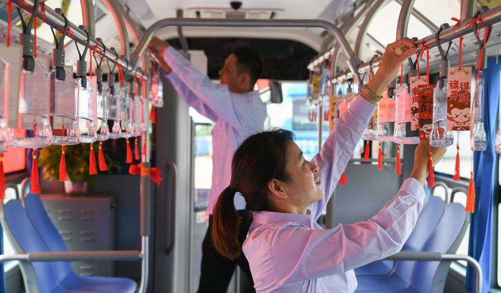 6月5日,在浙江省金华市交投公交集团客运金西公司,工作人员在高考送考公交车厢里挂祝福卡片。(新华社)