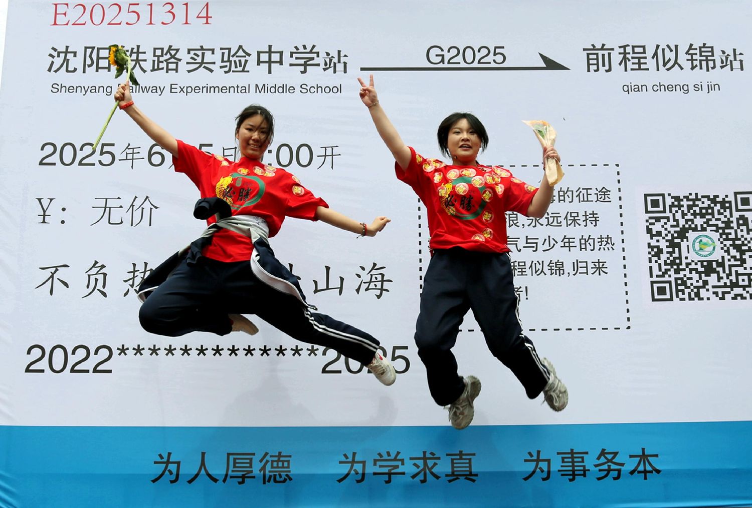 6月5日,辽宁沈阳铁路实验中学举行2025届学子高考祝福仪式,高三年级621名毕业生即将参加高考,全校师生为毕业生送上美好祝福。图为学生在主题背景板前留影。(中新网)