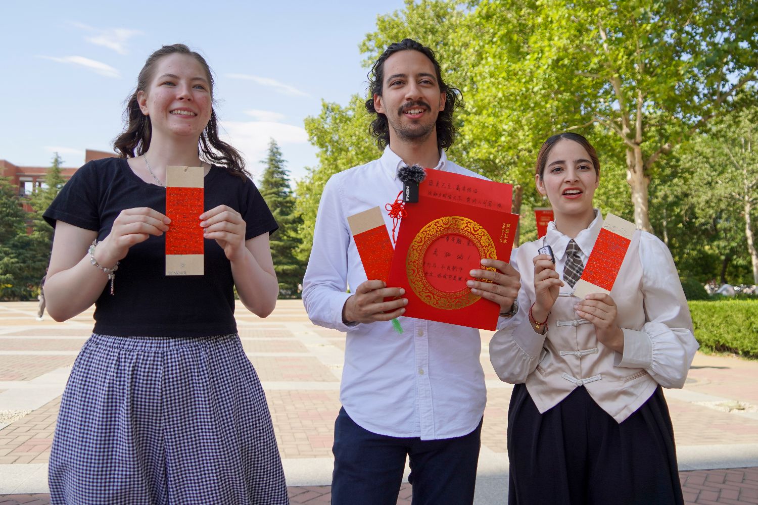 6月5日,河南郑州大学的中外大学生为即将参加高考的考生们手绘祝福书签,送上高考祝福。(中新网)