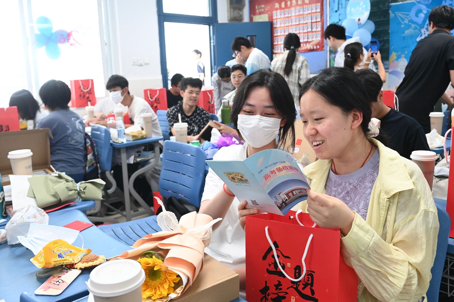 6月4日,安徽省合肥一中高三班级迎来在校“最后一课”,同学们接过班主任送的祝福,手中拿着向日葵、精美的毕业照……创意十足的送考活动让离校变得温情满满。图为学生在阅读“高考备战锦囊”。(中新社)