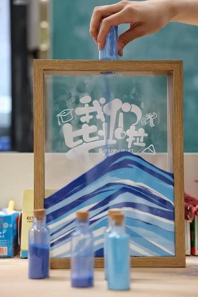 6月4日,山东省济钢高中高三年级的学子们离校,他们即将奔赴高考的考场。18班的班主任为每名同学准备了一瓶彩砂,同学们依次上台,将彩砂灌进写有“我们毕业啦”字样的沙画框。各种颜色的彩砂汇聚在一起,形成了一幅美丽的画面。(CFP)