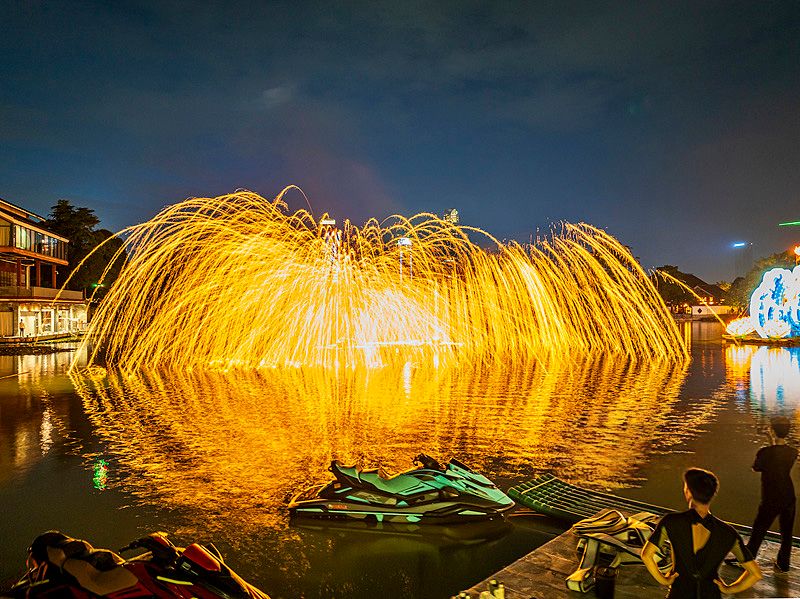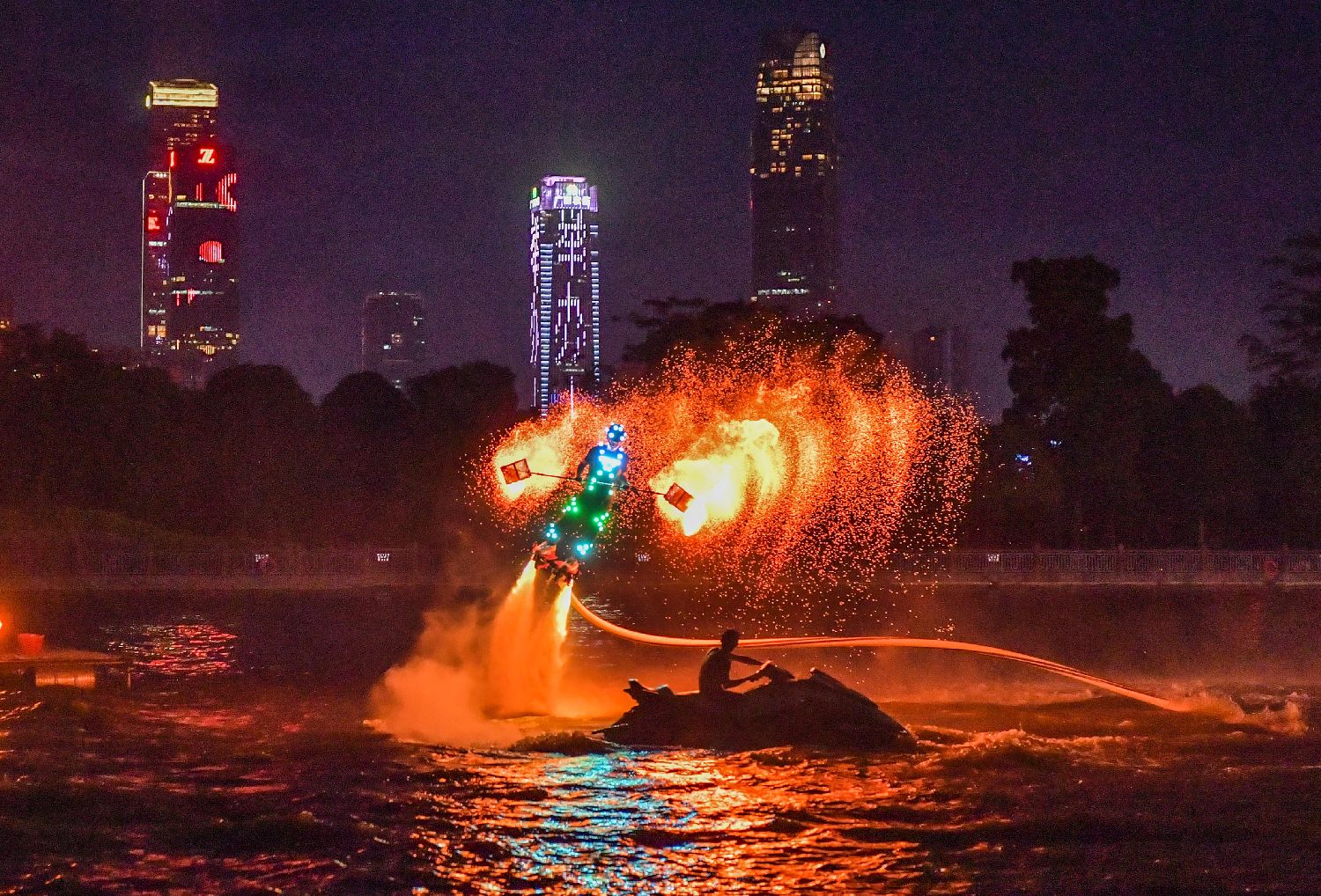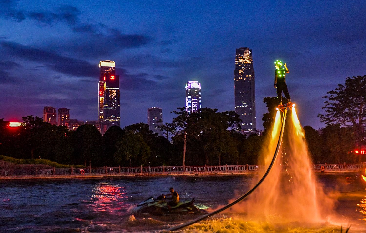 7月2日,中国广西南宁市青秀山风景区为丰富景区夜间旅游项目,进行试灯彩排。2025年青秀山“南宁夜花园”活动将于7月6日—9月14日、9月30日—10月8日,在青秀山北门区的兰园、荫生植物园、桂花园举办。声、光、影、水、雾、烟,加上酷炫全息影像,让青秀山变成了流动的奇幻画卷,六大梦幻主题板块,带你穿越奇幻之旅。并搭配花园市集、哪吒主题情景演绎、非遗打铁花及飞天火壶特技表演等丰富内容,为广大游客呈现一场艺术与色彩、传统与创新完美融合的视听盛宴,打造沉浸式夜游新模式。图为7月2日,广西南宁市青秀山风景区的特技表演。(中新网)