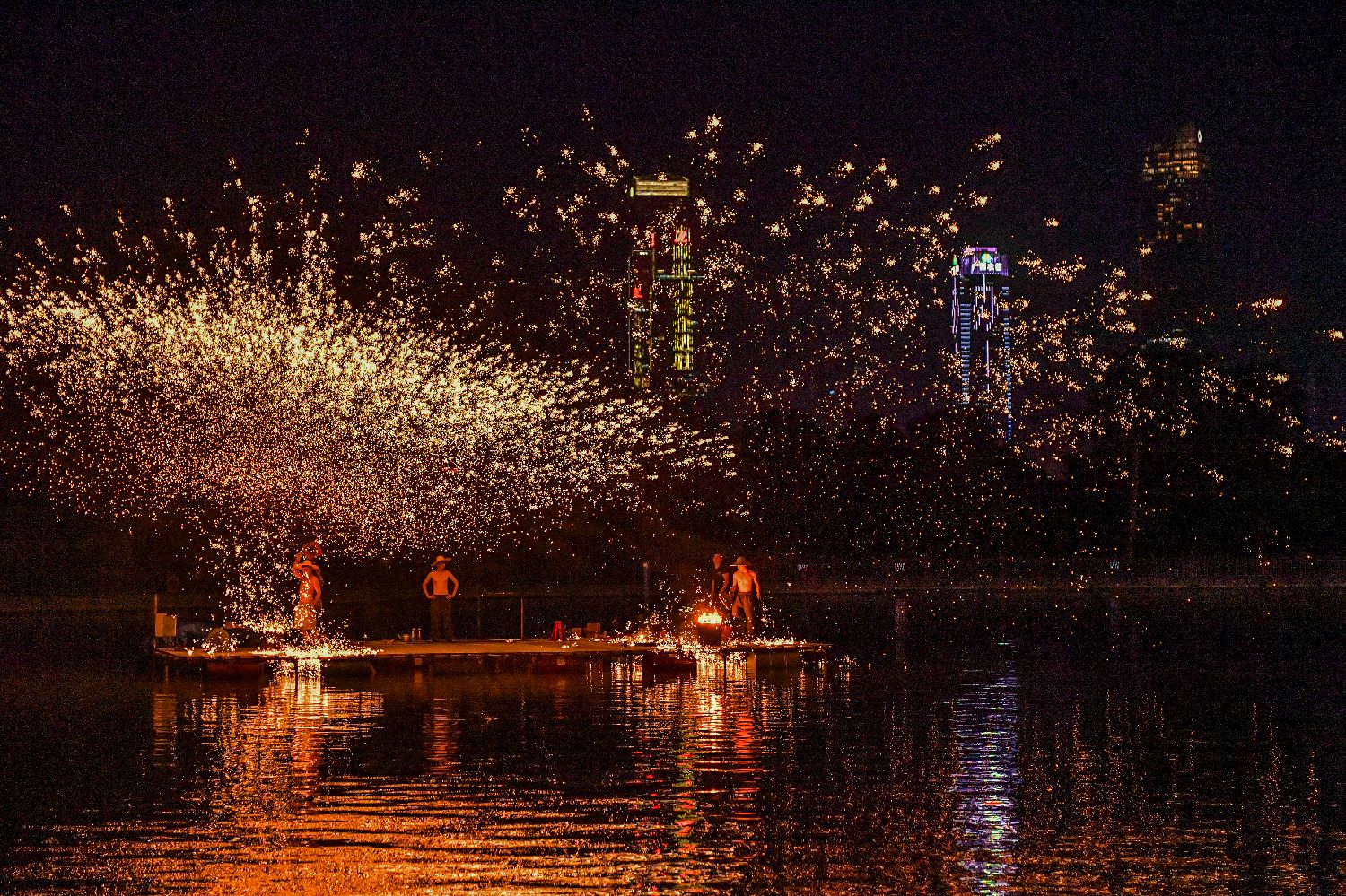 7月2日,广西南宁市青秀山风景区,打铁花表演。(中新社)