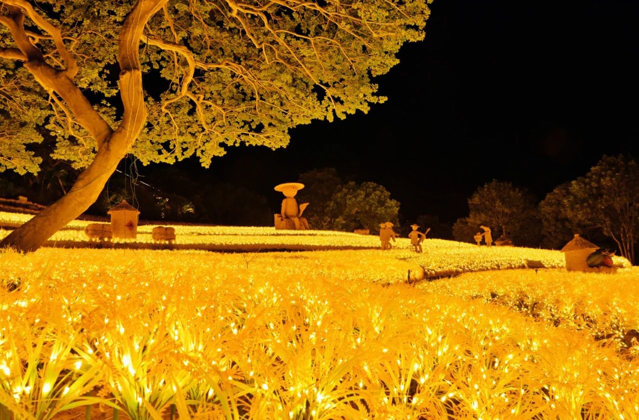 广西南宁市青秀山风景区的万盏稻穗灯海和巨型超萌稻草人。(南宁青秀山风景区微信公众号)