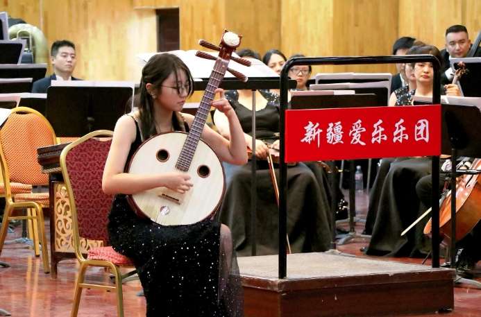 7月21日,来自台湾的罗巧慈在位于乌鲁木齐市的新疆艺术剧院弹奏传统乐器中阮。