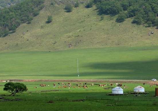 6月18日,内蒙古兴安盟,乌兰毛都草原碧野无限,蒙古包和牛群点缀其中。(图片来源:中新社)