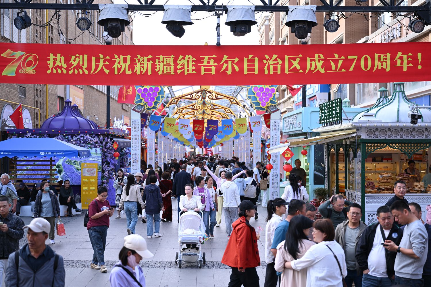 9月23日,游客在新疆乌鲁木齐市大巴扎步行街游览、拍照。为庆祝新疆维吾尔自治区成立70周年,乌鲁木齐多处摆设花堆和宣传牌等,街头洋溢着喜庆祥和的氛围。