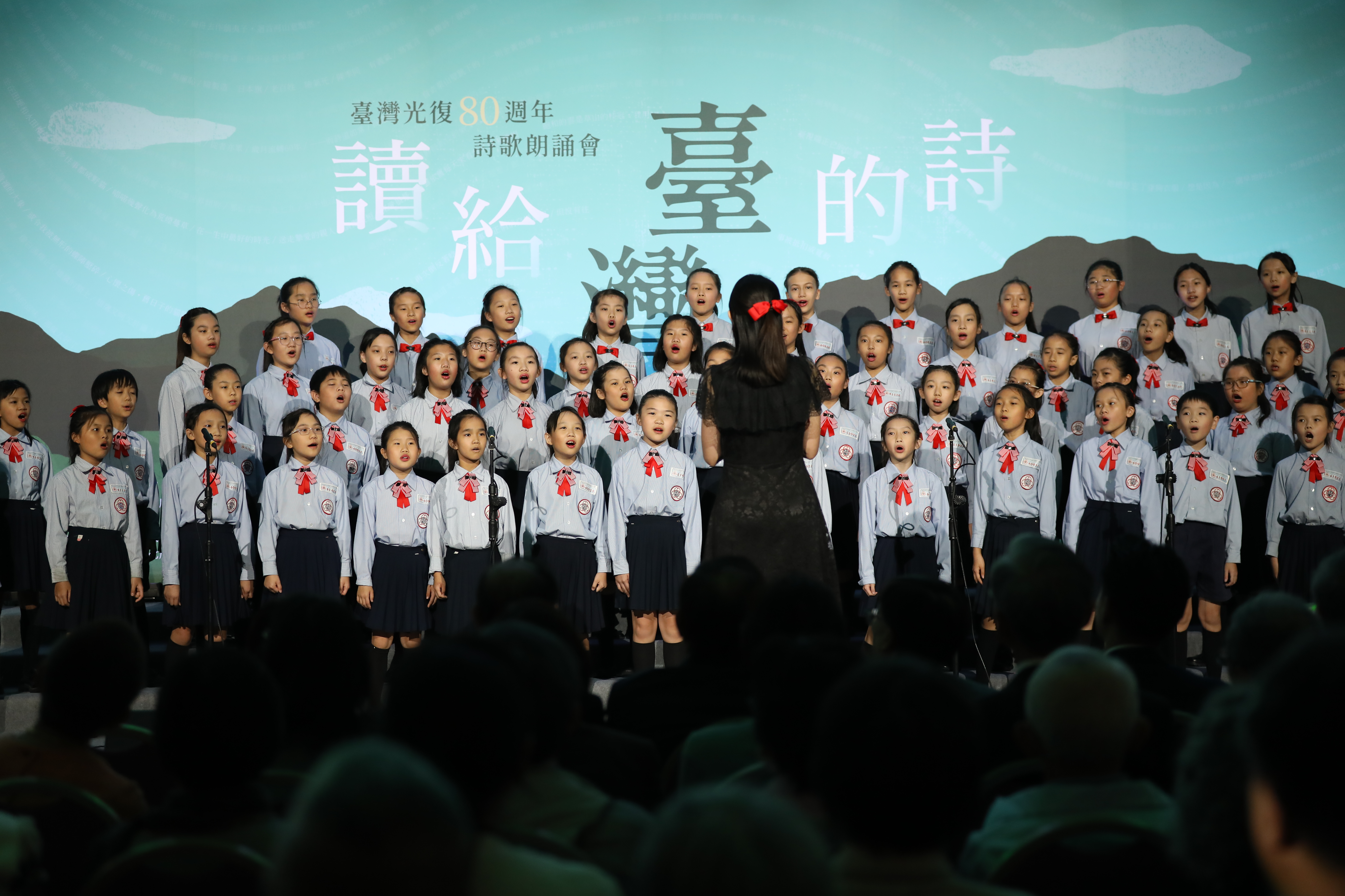 当地时间10月22日晚,“读给台湾的诗——台湾光复80周年诗歌朗诵会”在台北市中山堂光复厅举行。80年前,这里举行了中国战区台湾省受降典礼。图为新北市中和小学合唱团带来歌曲表演。
