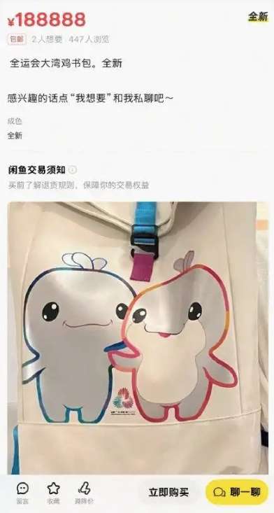 近日,全运会吉祥物“大湾鸡”(系网友戏称,大会吉祥物是“喜洋洋”和“乐融融”两只中华白海豚)走红网络,相关文创产品引发消费者购买热潮:开幕式背包在二手平台挂出了最高188888元人民币的高价,周边产品线上、线下实体店卖爆,全国各地网友纷纷求购……