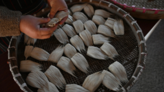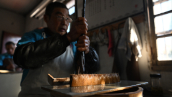 11月20日,在泾县三兔宣笔有限公司内,工人进行宣笔制作工艺中的“齐毫”环节。韩苏原摄