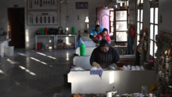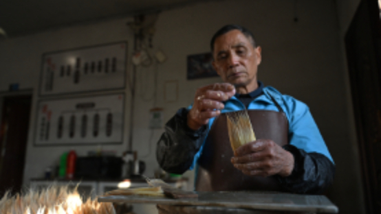 11月20日,在泾县三兔宣笔有限公司内,工人进行宣笔制作工艺中的“晾晒”环节。韩苏原摄