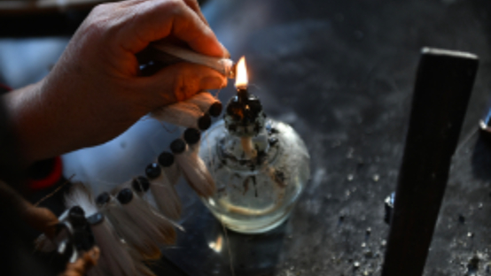 11月20日,在泾县三兔宣笔有限公司内,工人进行宣笔制作工艺中的“扎笔头”环节。韩苏原摄