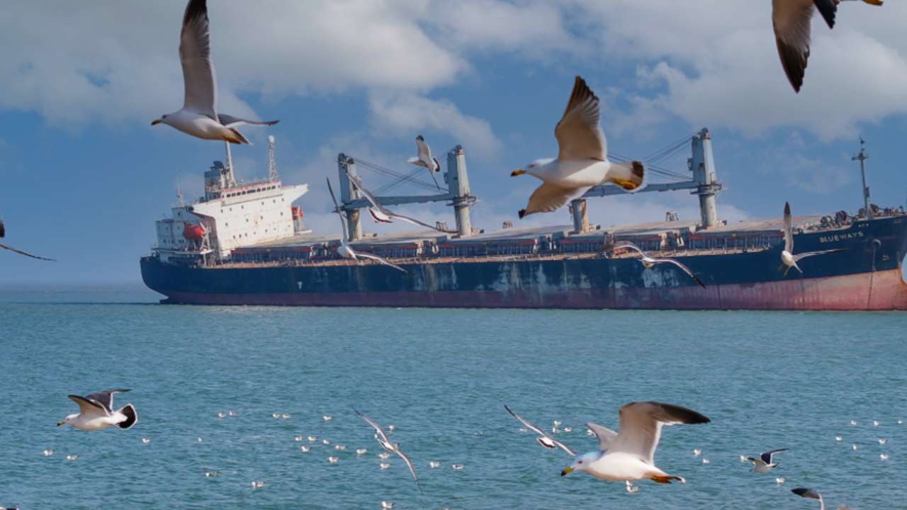 海上,巨轮与碧海蓝天、嶙峋礁石
