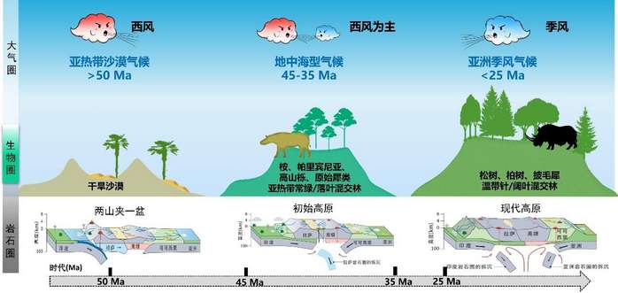 在本项研究中,研究团队结合青藏高原隆升过程和东亚气候演变的地质、古气候与模拟证据,系统阐释了高原差异隆升过程与东亚地区从干旱沙漠转变为“鱼米之乡”的机理连通性。