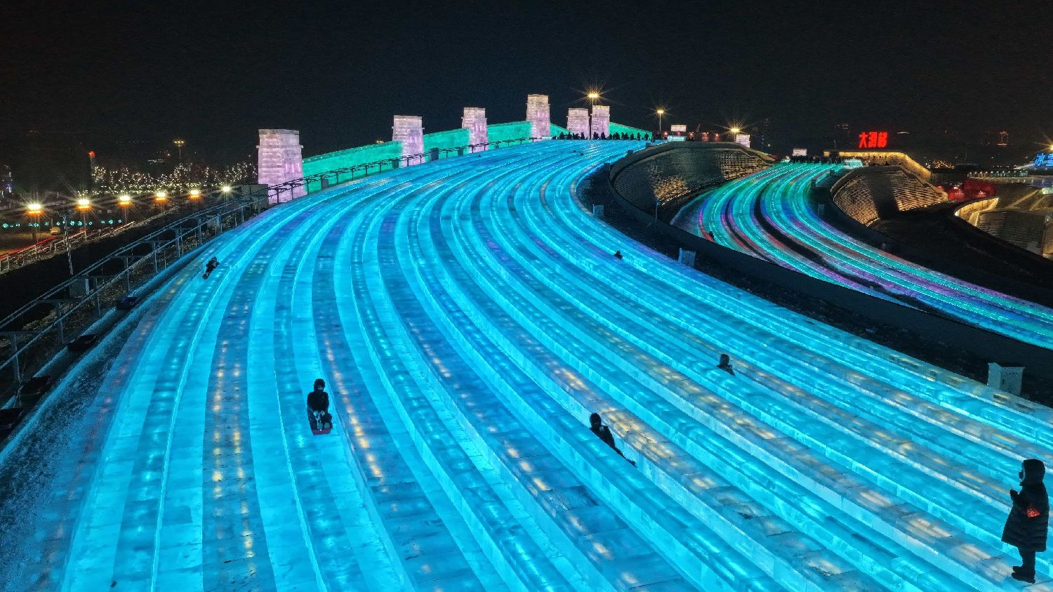12月17日,第二十七届哈尔滨冰雪大世界开园,图为游客体验521米超级冰滑梯。