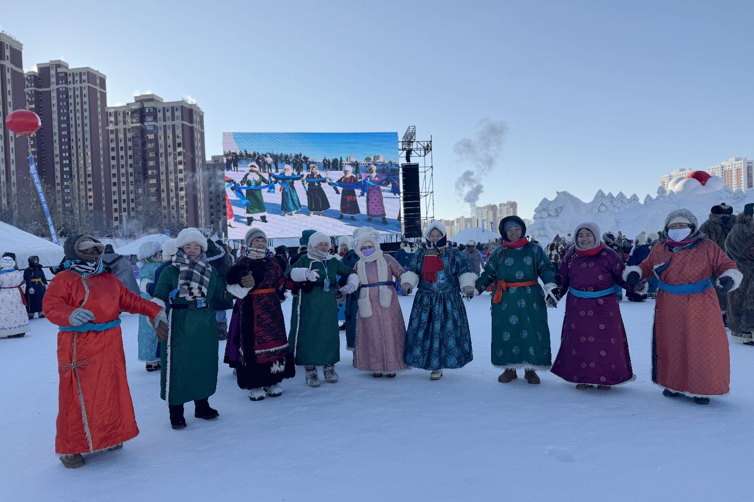 12月21日,内蒙古呼伦贝尔,民众在冰雪那达慕现场载歌载舞。