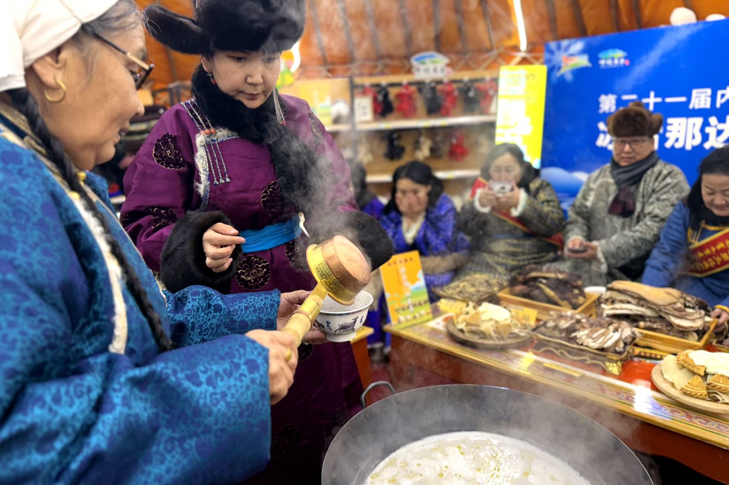 12月21日,内蒙古呼伦贝尔,来自巴尔虎草原上的老额吉(额吉,蒙古语,意为母亲)为远道而来的客人熬奶茶。