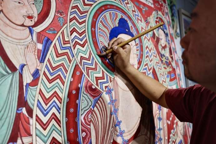 下笔临摹之前,徐东良总要静心读画。“一点一点观察,将颜色运用、线条技法等吃透后再落笔。有时候一幅画要读好多天,这个过程就好像是在与千年前的画师隔空对话。”他说,临摹后的壁画要供历史研究人员参考,所以就必须非常准确,误差不能超过两毫米。