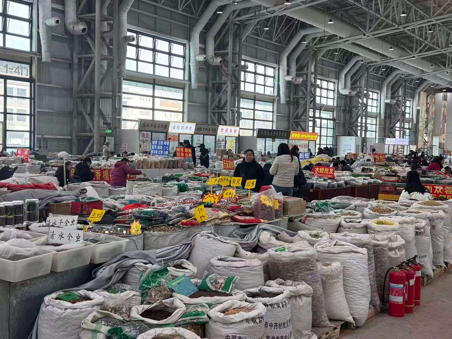 12月16日,安国中药材批发交易市场里,各种药材被整齐码放在摊位前。