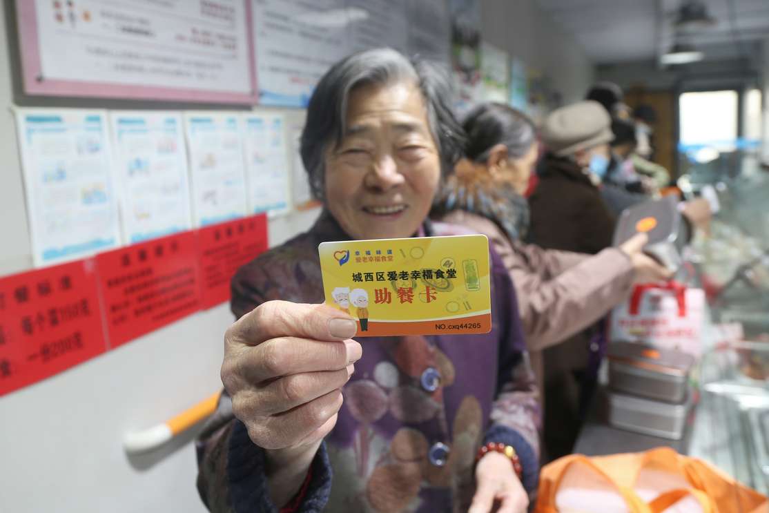 12月15日,在青海省西宁市城西区新西社区的爱老幸福食堂内老人展示助餐卡。据悉,青海省已建成城市社区养老助餐点217个,538个农村互助幸福院同步提供助餐服务,年均惠及10万名经济困难老人与高龄老人。