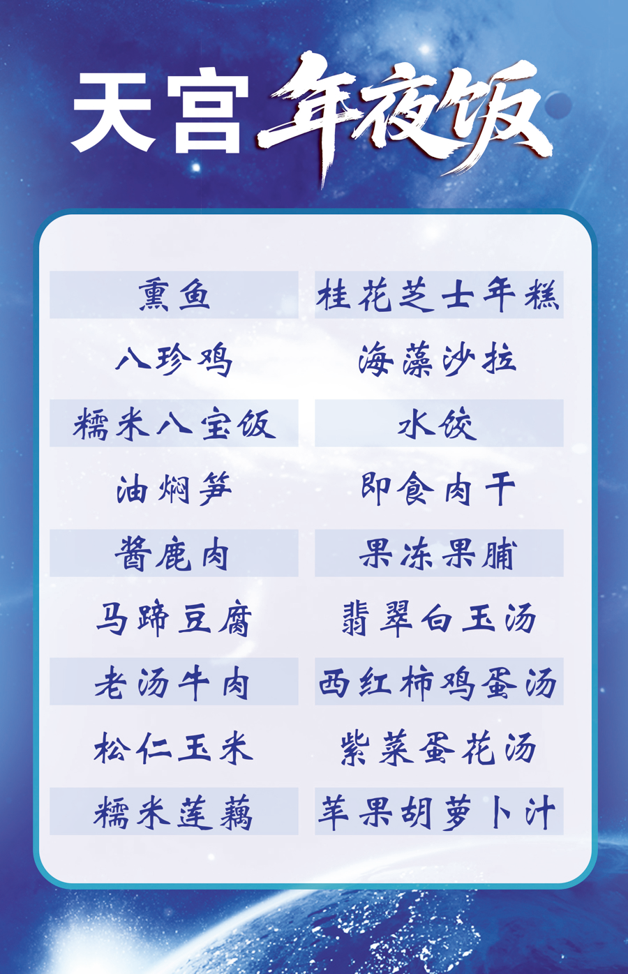 此后,航天食品种类不断增加,目前已达190多种。2016年神舟十一号乘组的太空食谱周期从4天延长到5天,三餐外还有许多点心和夜宵,以保证航天员30天驻留空间站之需。从神舟十四号开始,地面人员还不时为航天员准备食品盲盒,待其完成重大任务或生日时,就能收获惊喜。这两年,太空年夜饭菜谱之丰盛,常令地球人也垂涎三尺。