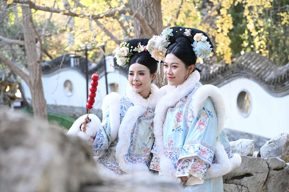 11月16日,来自越南的游客在北京宣武艺园体验古装旅拍。