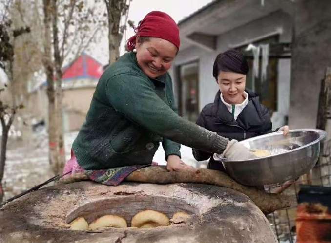 资料图:贺娇龙(右)生前帮助村民帕纳尔古丽·阿里木拉提打馕。