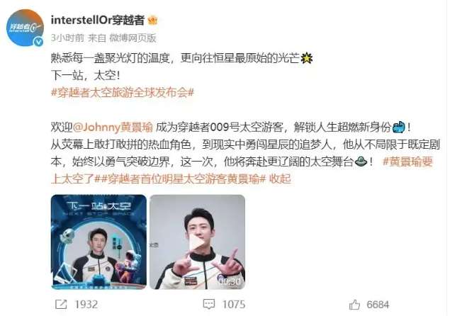 1月22日,@interstellOr穿越者官宣黄景瑜成为009号太空游客。(图片来源:社交媒体截图)