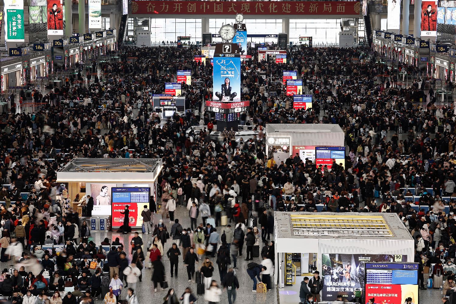 2月2日,旅客在铁路上海虹桥站等待验票上车。