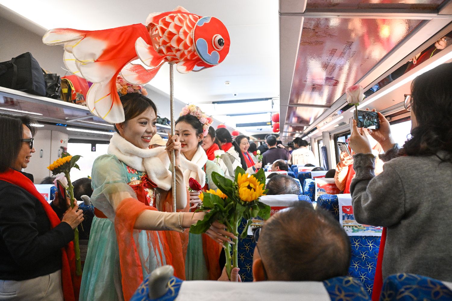 2月4日,演员在中老铁路列车上向旅客送上鲜花和祝福。(图/中新社)