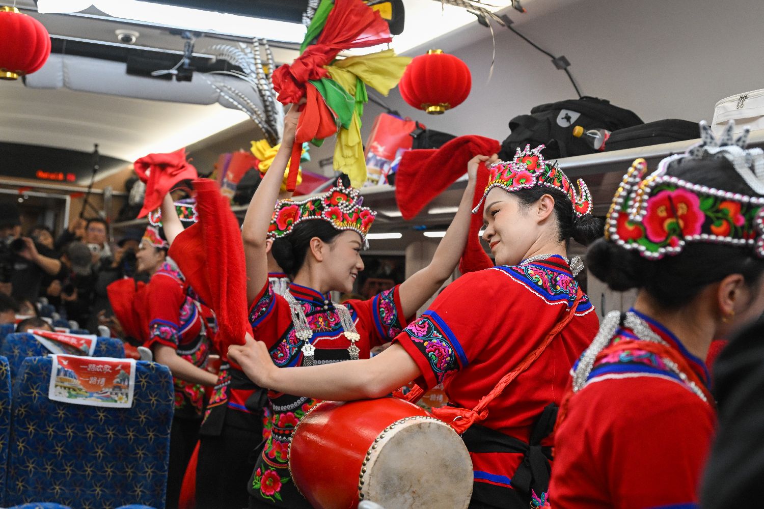 2月4日,演员在中老铁路列车上表演歌舞《花鼓·花鼓》。(图/中新社)