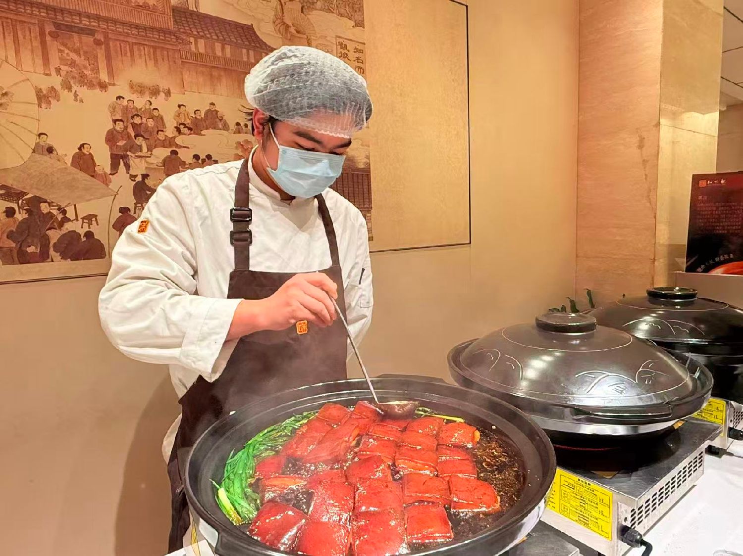 2月5日,在杭州知味观总店,厨师正在精心烹饪“东坡肉”,这道菜也是往年春节期间最受欢迎的菜品。