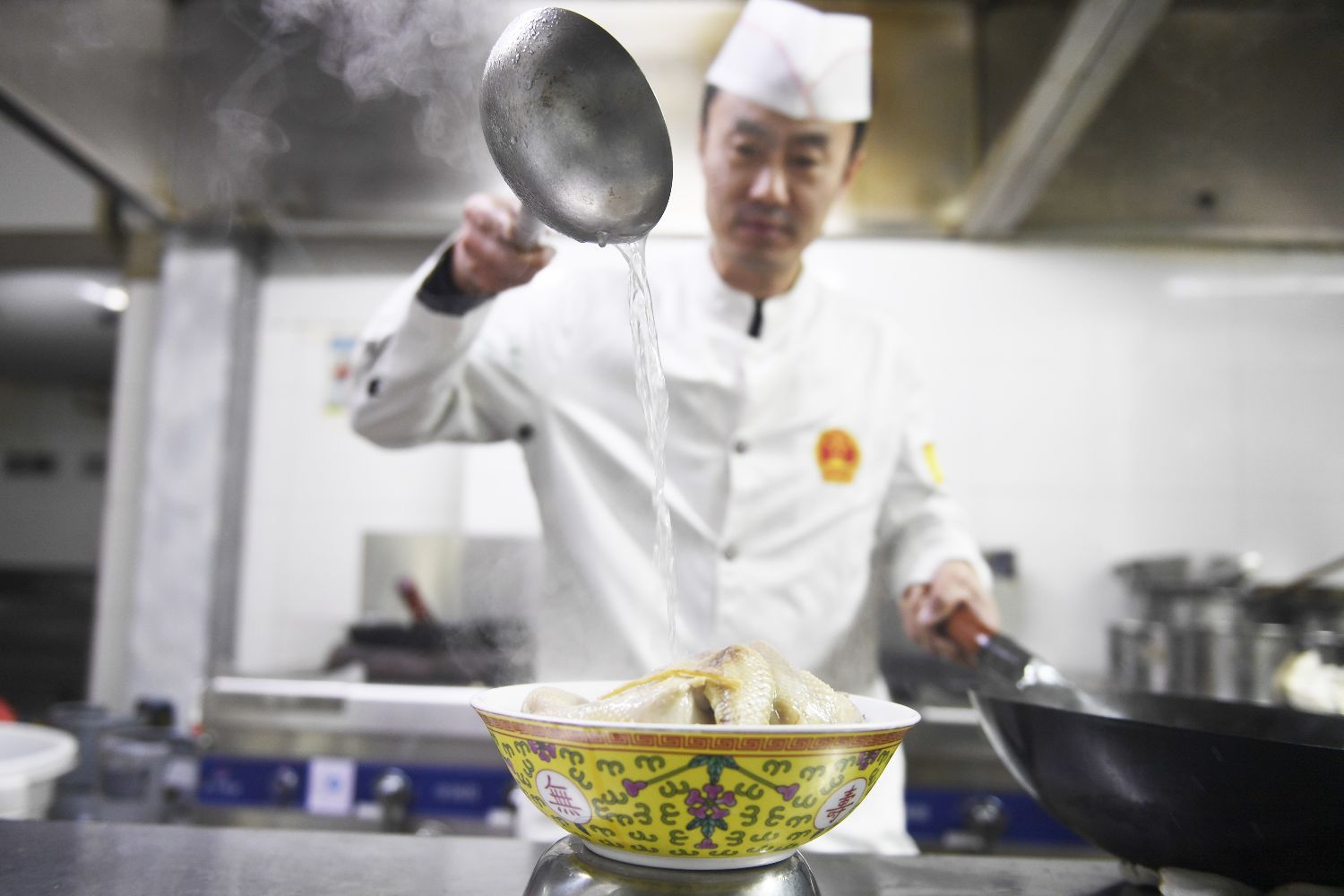2月5日,吉林石光酒楼的后厨里,厨师烹饪“满族八大碗”菜品小鸡榛蘑粉。(图/中新社)