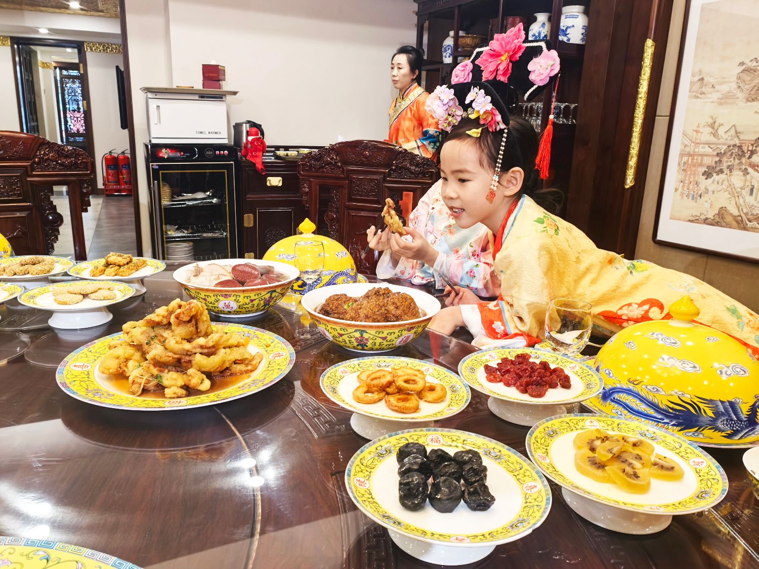 2月5日,吉林省吉林市,身穿满族服饰的小食客品尝“满族八大碗”。(图/中新社)