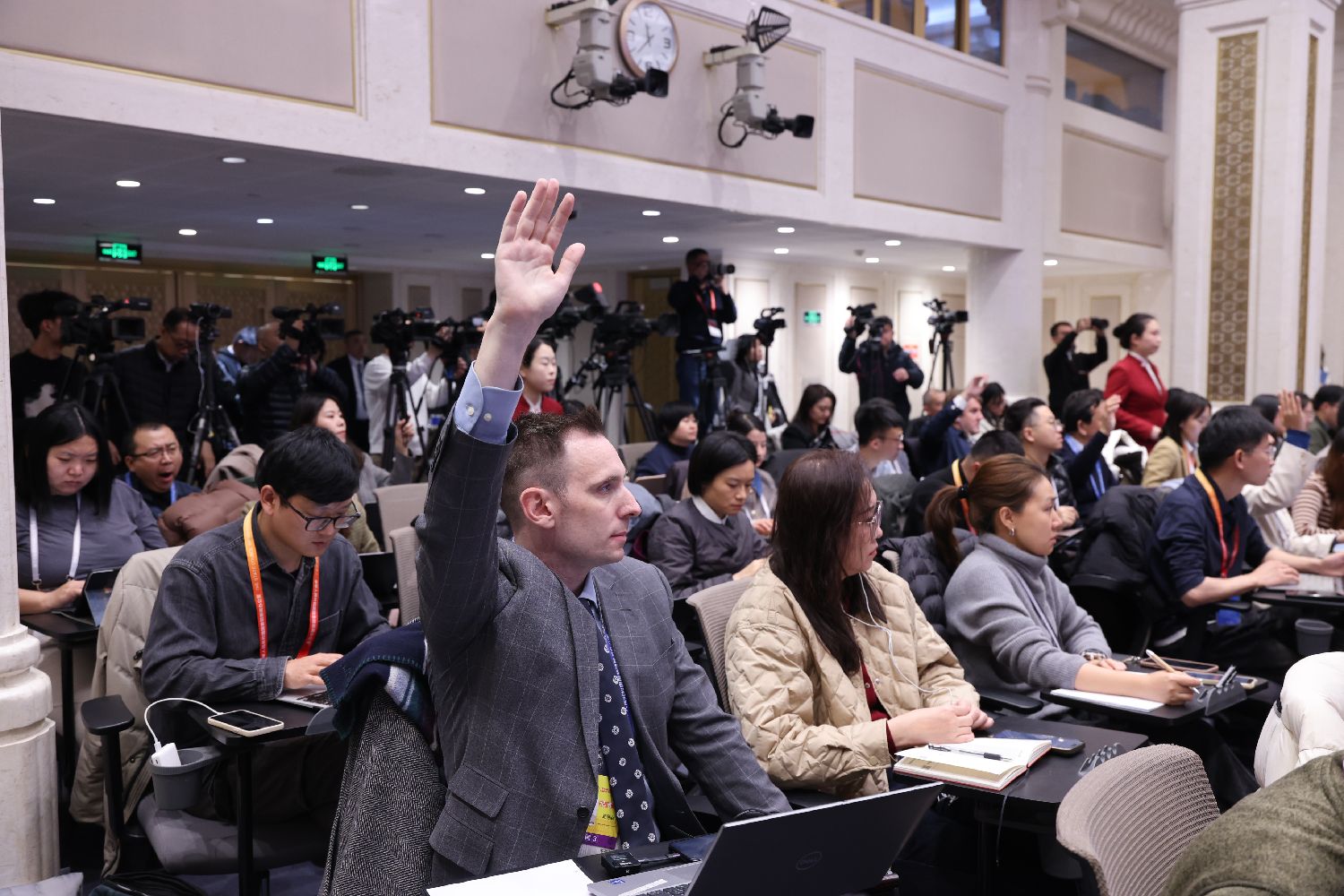 3月5日,中国国务院新闻办公室在北京举行吹风会,请《政府工作报告》起草组负责人、国务院研究室主任沈丹阳,《政府工作报告》起草组成员、国务院研究室副主任陈昌盛解读《政府工作报告》,并答记者问。图为美国国际市场新闻社记者举手提问。(图片来源:中新社)