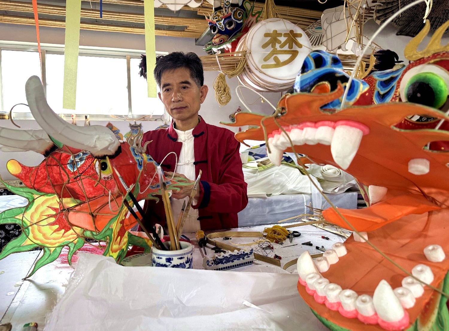 2月24日,山东潍坊,郭洪利在工作室赶制龙头蜈蚣风筝。
