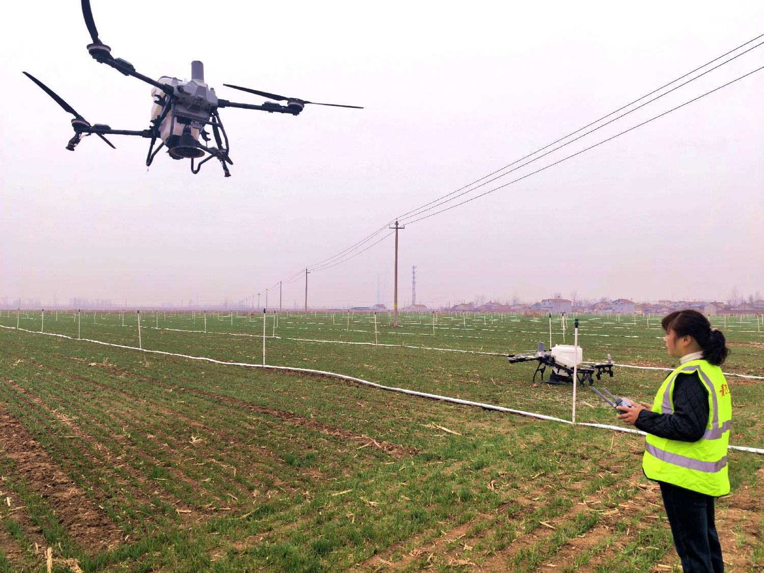 2月27日,山东菏泽郓城,飞手在麦田操作无人机,准备开展施肥作业。