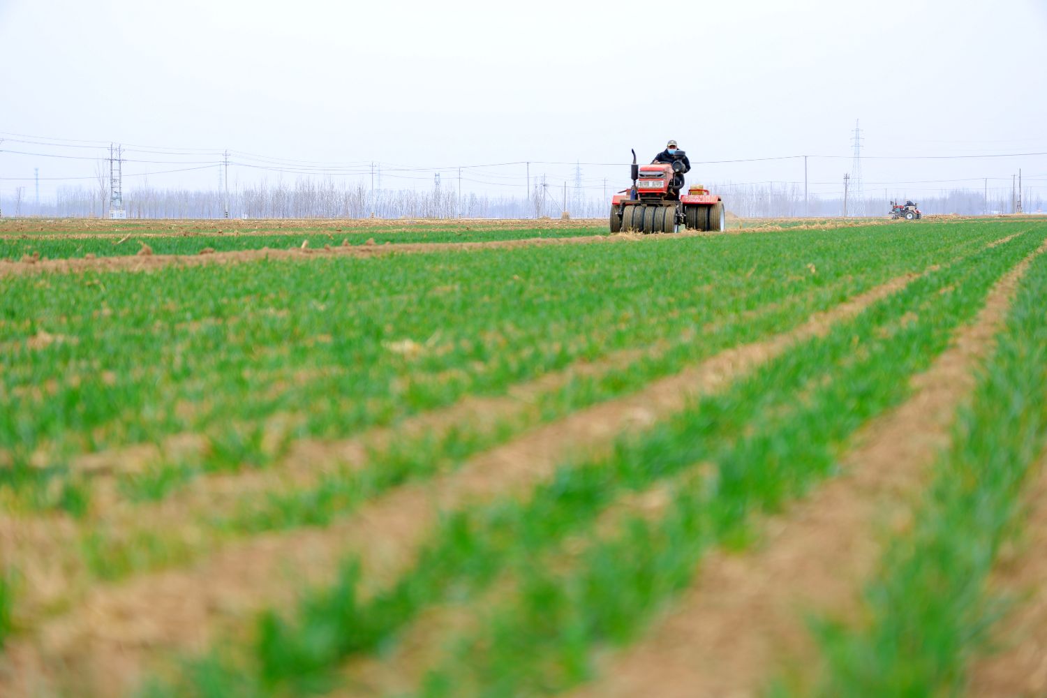 2月25日,山东聊城茌平,农民驾驶农机,对小麦进行春管作业。