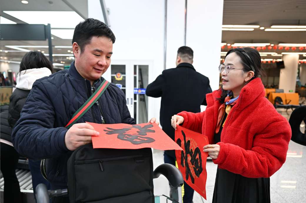 1月27日,浙江省侨联工作人员(右)向返乡的欧洲侨胞送福帖。当日,浙江杭州机场举办“浙里有爱欢迎回家”暨“返乡直通·情满旅途——联程无忧·直通枢纽”主题活动。百余名欧洲侨胞从马德里抵达杭州,享受“空地联运”便捷服务,乘坐丽水青田专线巴士返乡。