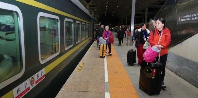 图为北京时间3月6日晚,游客在西宁站登车,乘坐2026年首趟入藏旅游专列。