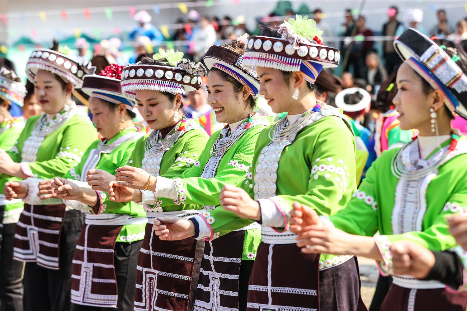 2月21日,贵州省龙里县湾滩河镇果里村举行一年一度的“跳洞”活动。图为苗族民众穿着节日盛装跳舞。