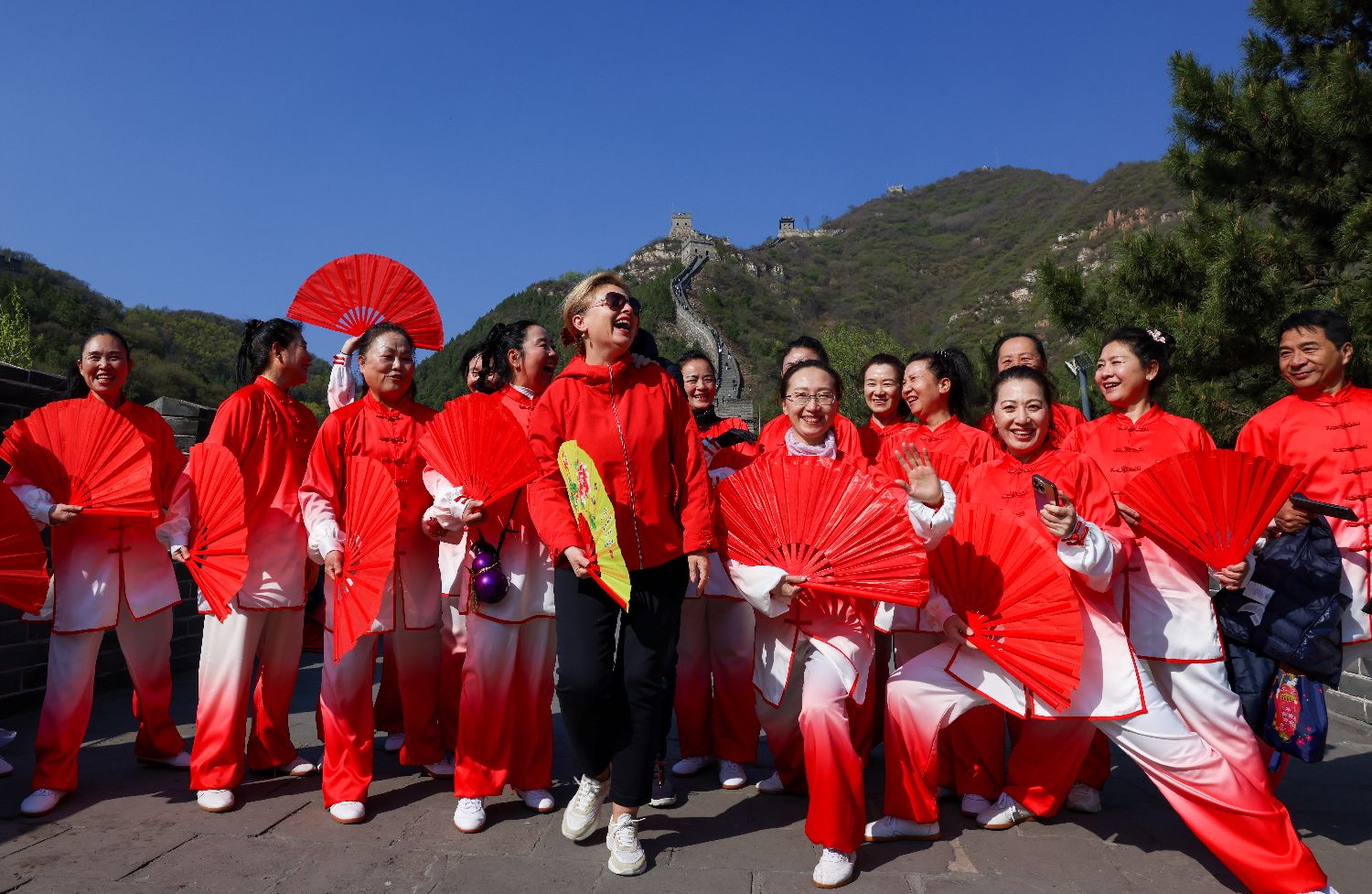 北京市丰台武术运动协会的会员们在居庸关长城上展演太极扇,吸引外国游客合影留念。