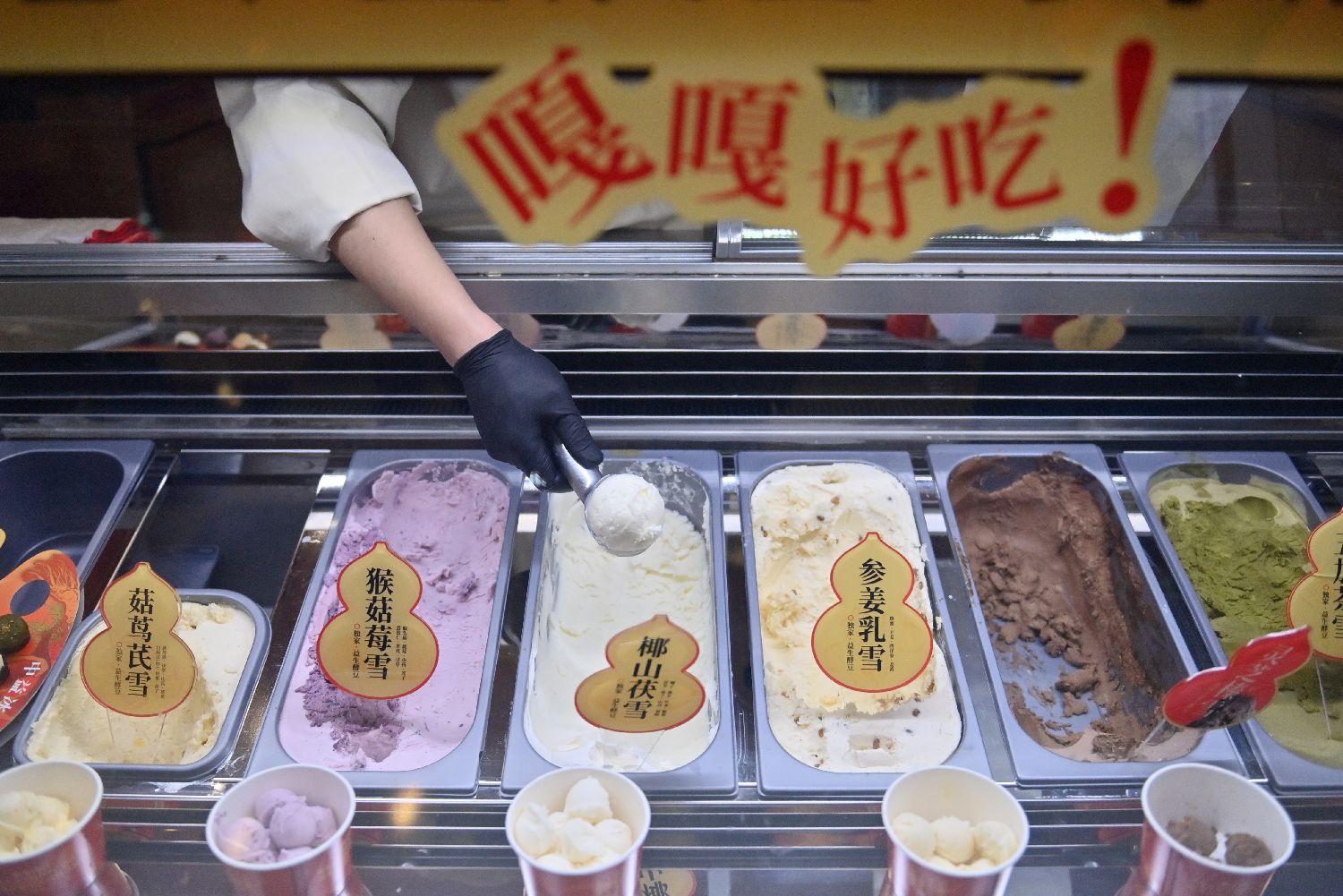 在长春一家商场的中药甜品店,工作人员在舀取中药冰淇淋。这家中药甜品店将刺五加、人参、灵芝等中药与传统甜品相结合,推出了中药冰淇淋、中药茶饮等产品,吸引不少顾客体验。