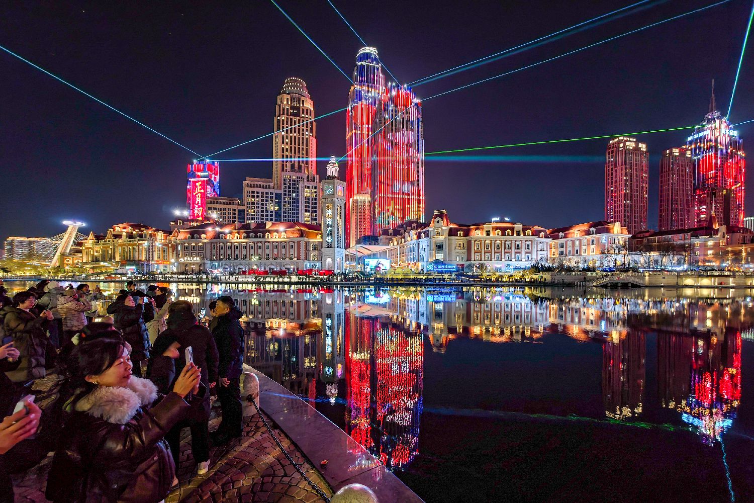 游客在天津海河畔观赏春节主题灯光秀。