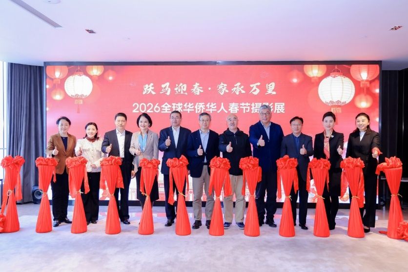 嘉宾们为2026全球华侨华人春节摄影展揭幕。